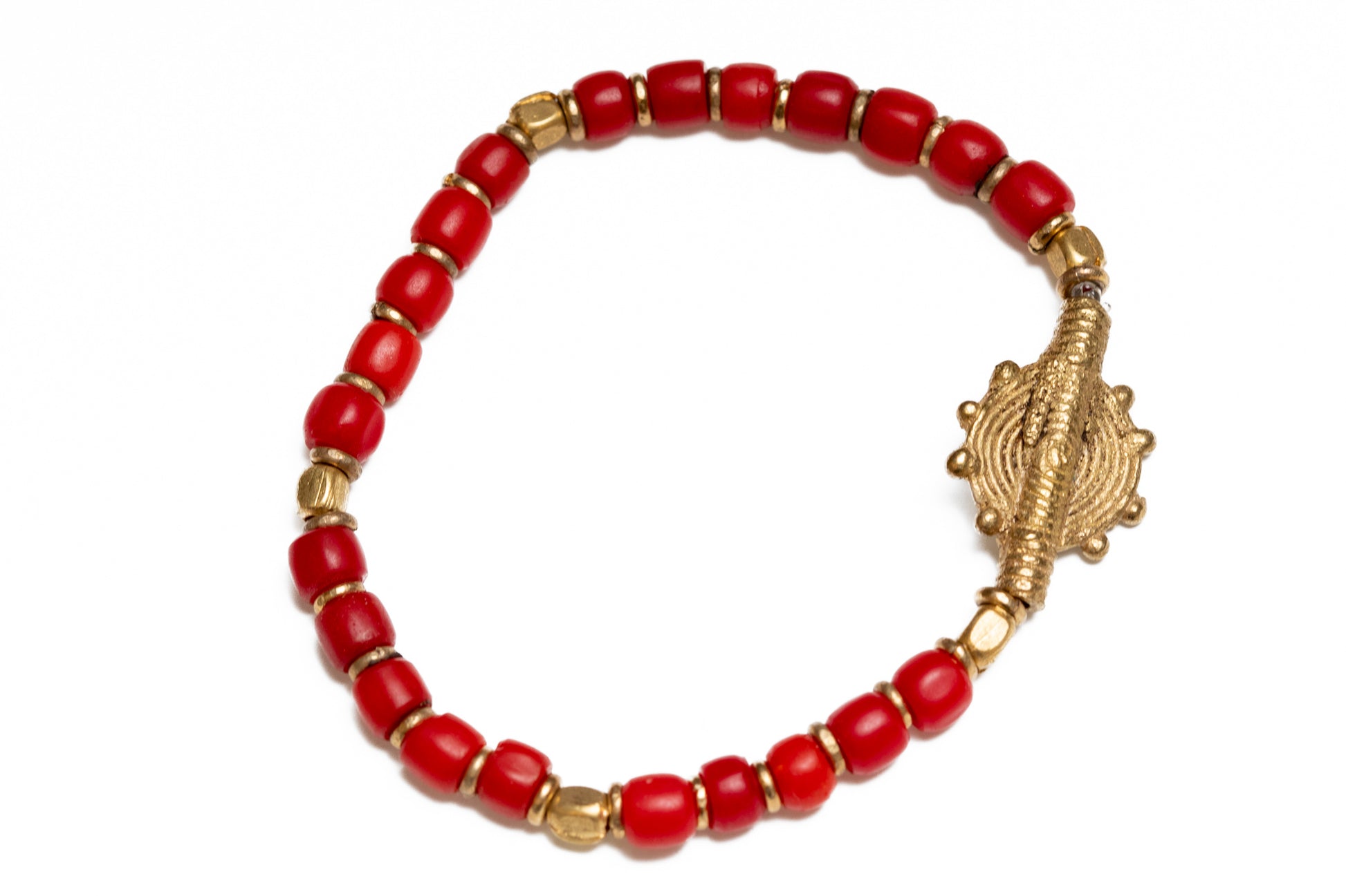 Ett vackert och unikt armband i röd och mässingsgul färg, handgjort med omsorg och eftertanke i Kenya. Varje pärla är unik och varierar i form och storlek, vilket gör varje smycke till ett unikt hantverk att bära med stolthet.