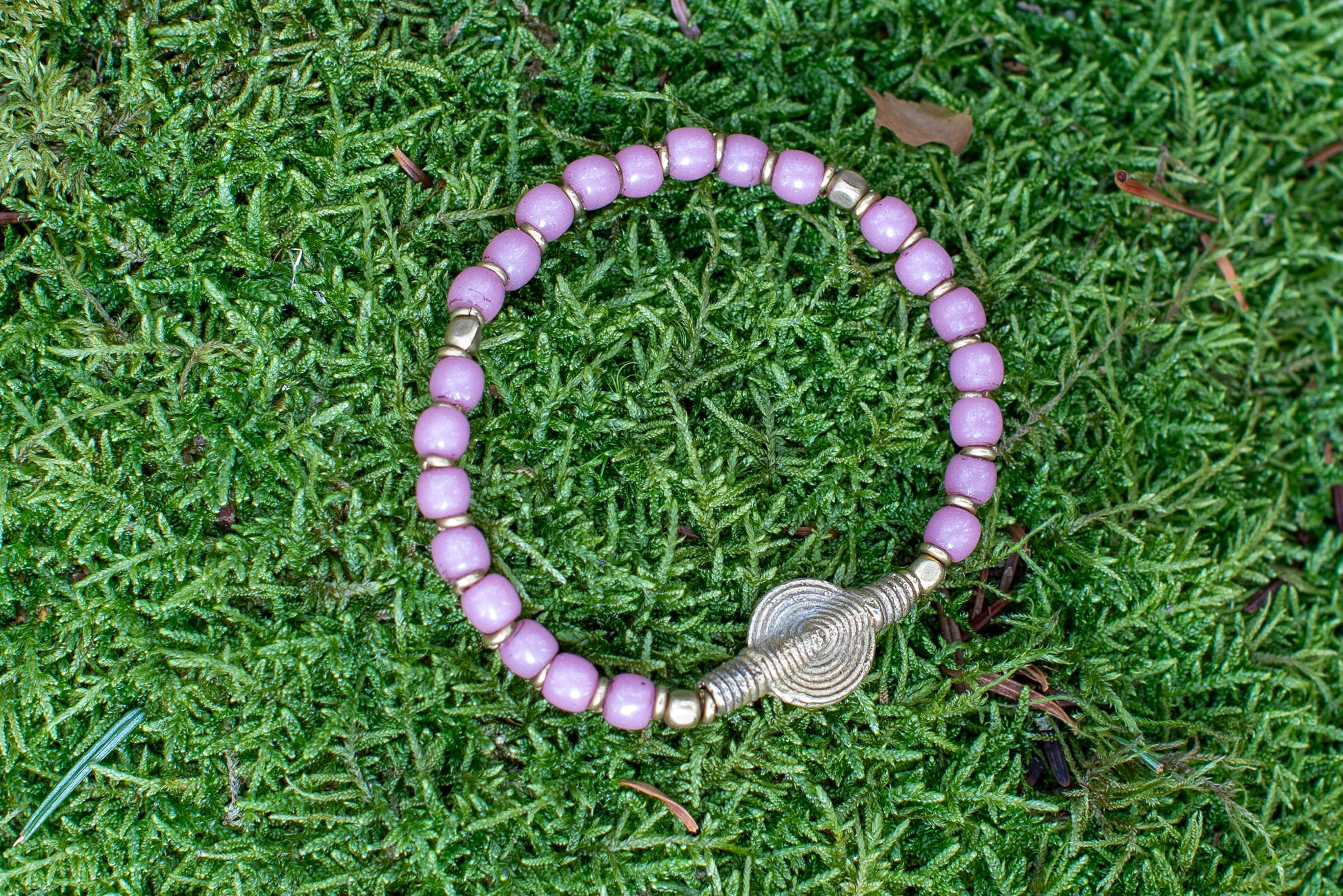 Ett vackert och unikt armband i rosa och mässingsgul färg, handgjort med omsorg och eftertanke i Kenya. Varje pärla är unik och varierar i form och storlek, vilket gör varje smycke till ett unikt hantverk att bära med stolthet.