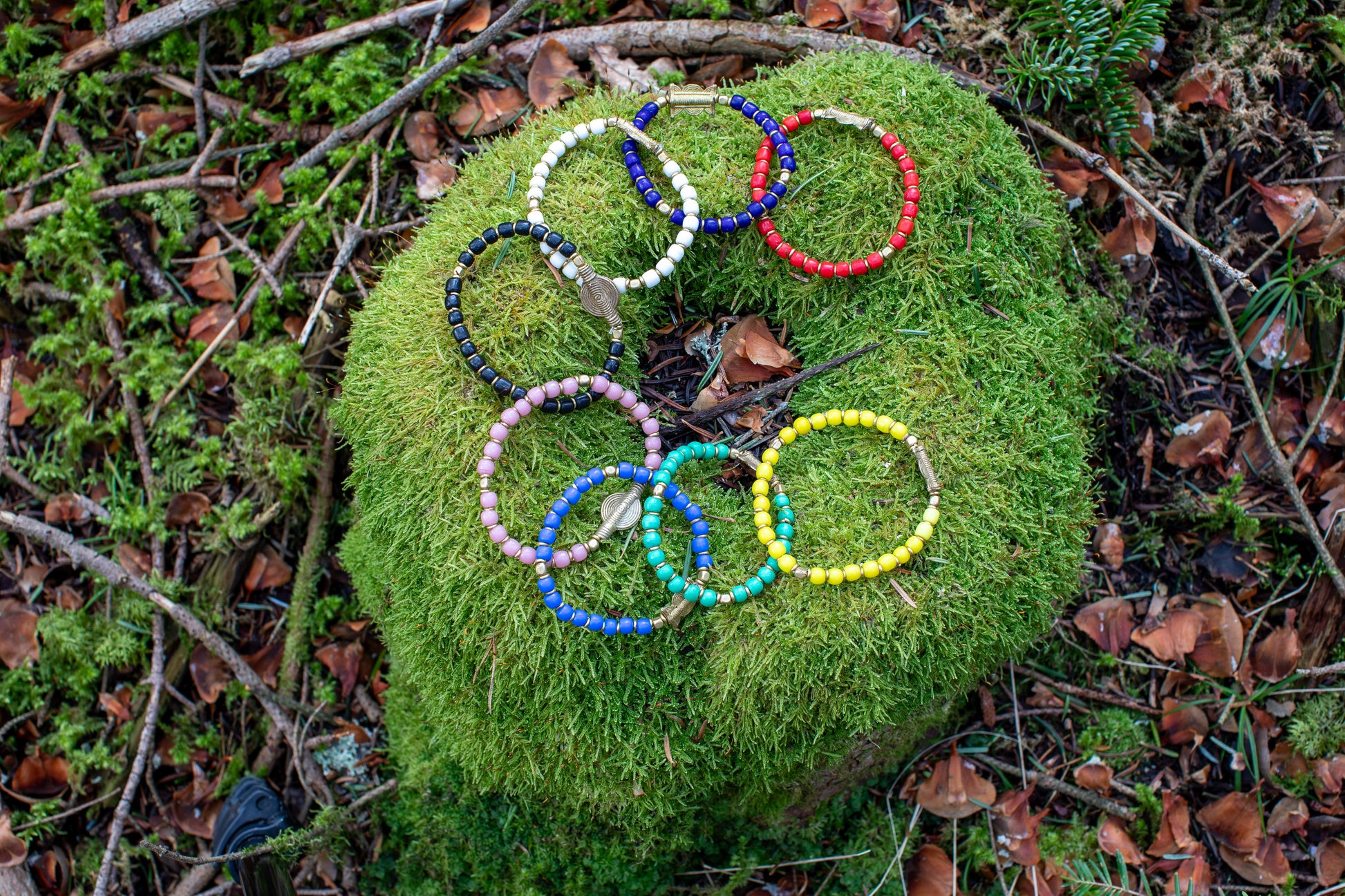 Glaspärlorna i detta armband har en fascinerande bakgrund. Ursprungligen kom de från Italien genom byteshandel och har blivit en del av de ikoniska halsband som bärs av Turkanakvinnorna i Kenya. När dessa halsband går sönder köps de upp av en kenyansk entreprenör som tvättar och återvinner pärlorna. Därefter används de av smyckesdesigners för att skapa nya smycken, som detta armband.