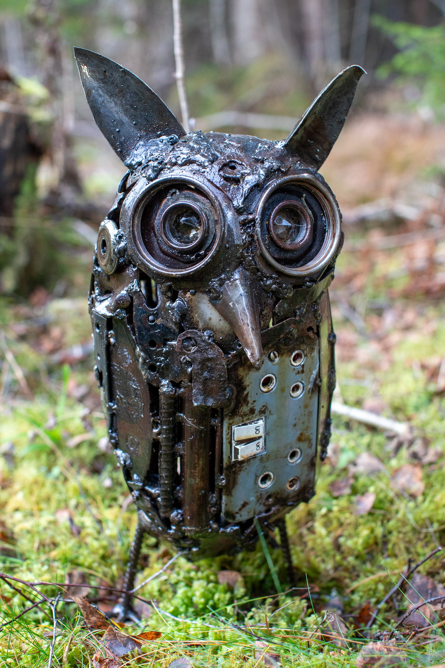 Handgjord uggla tillverkad av återvunnen metall och olika reservdelar. Ugglan blir fin som inredning inomhus eller som trädgårdskonst .