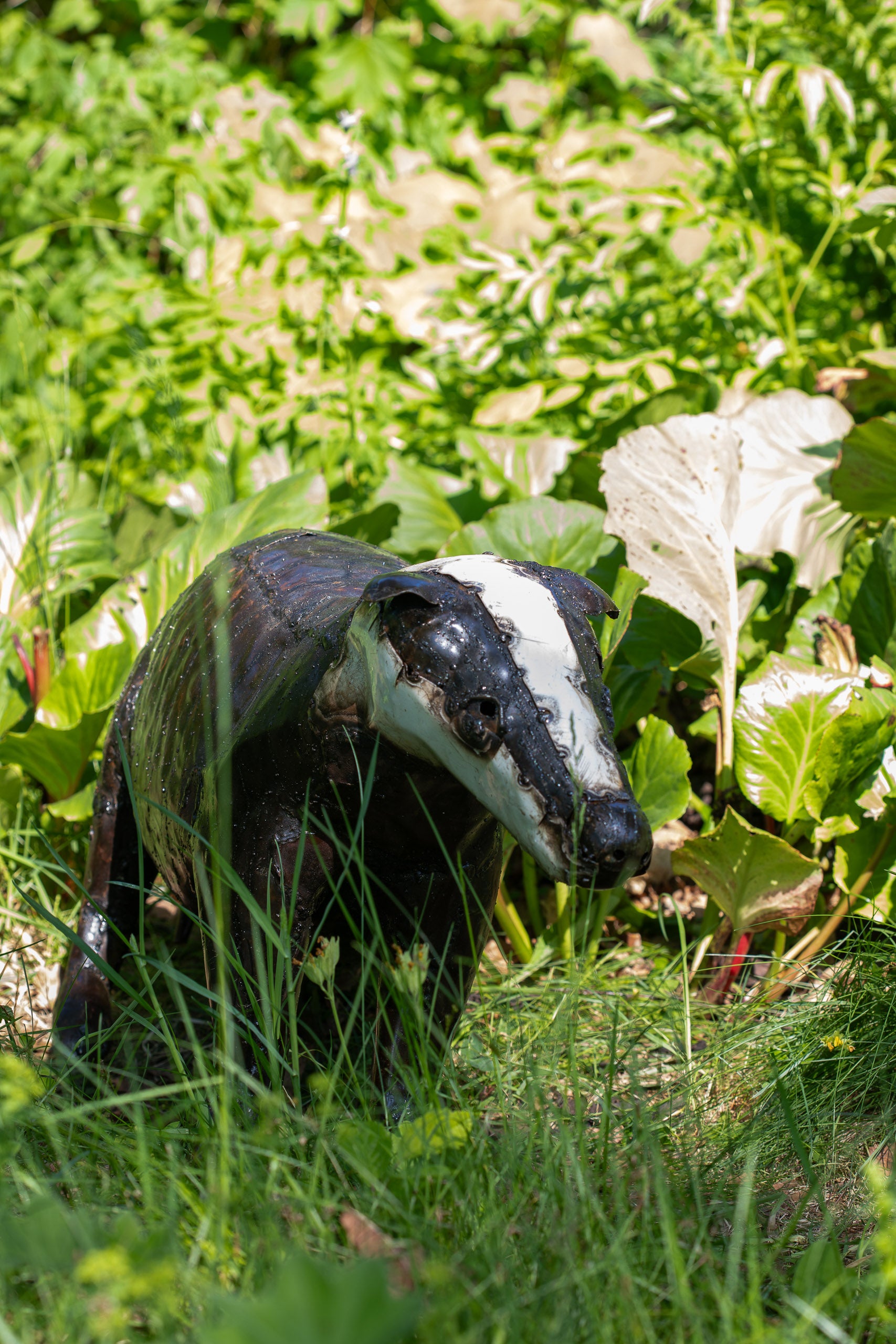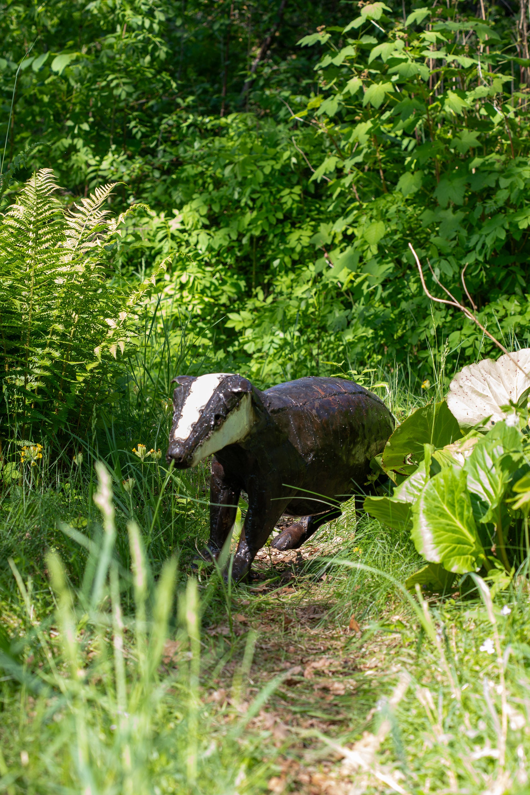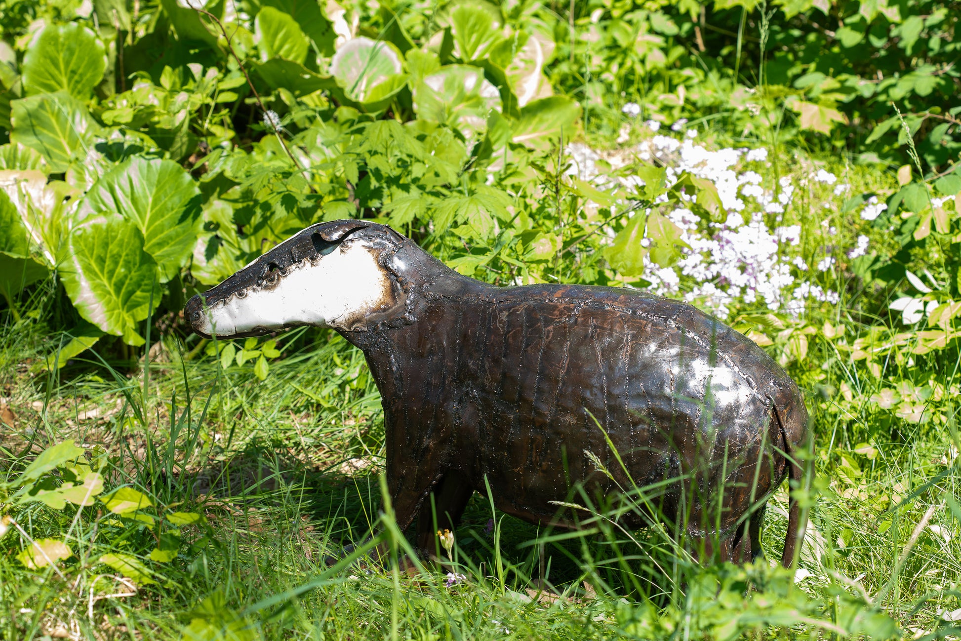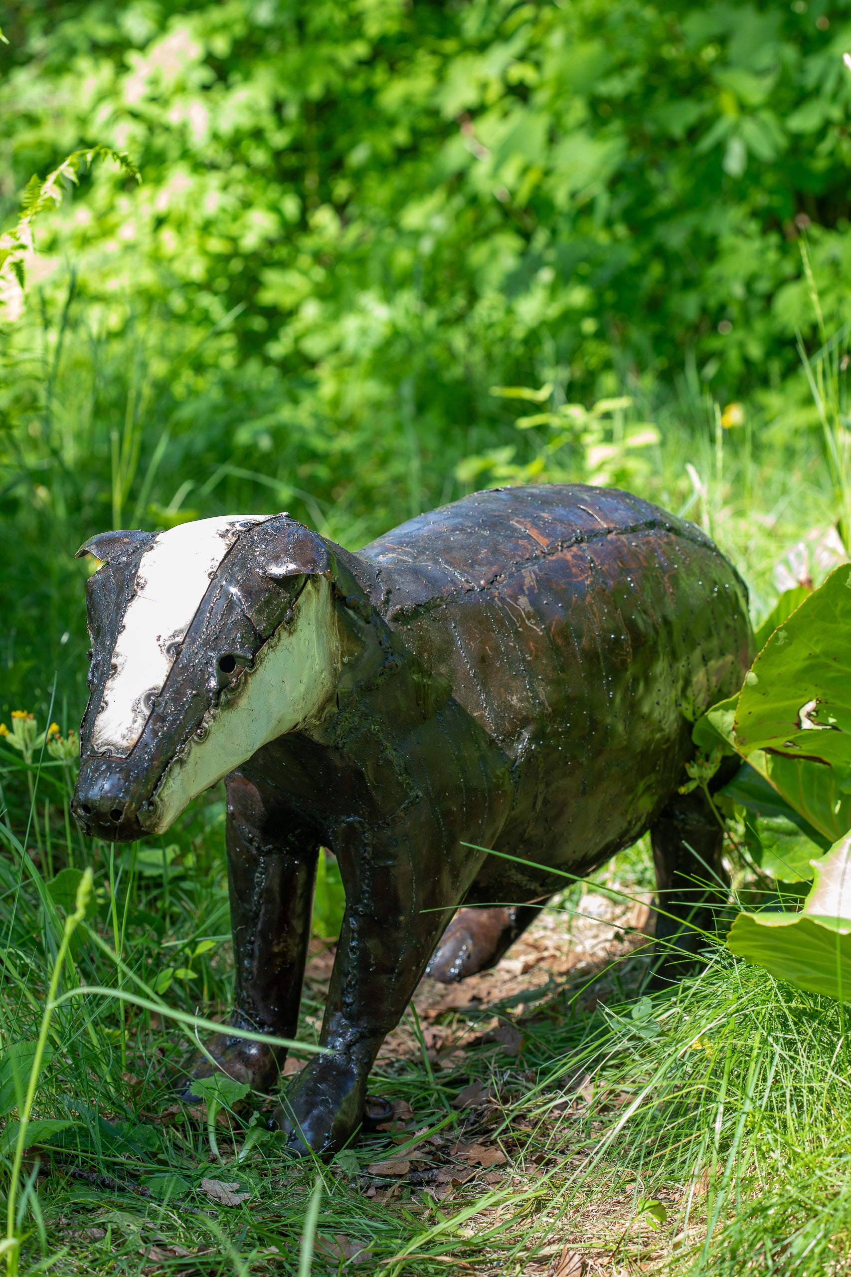 Grävling tillverkad av återvunnen metall. Den blir fin inomhus eller som trädgårdskonst .