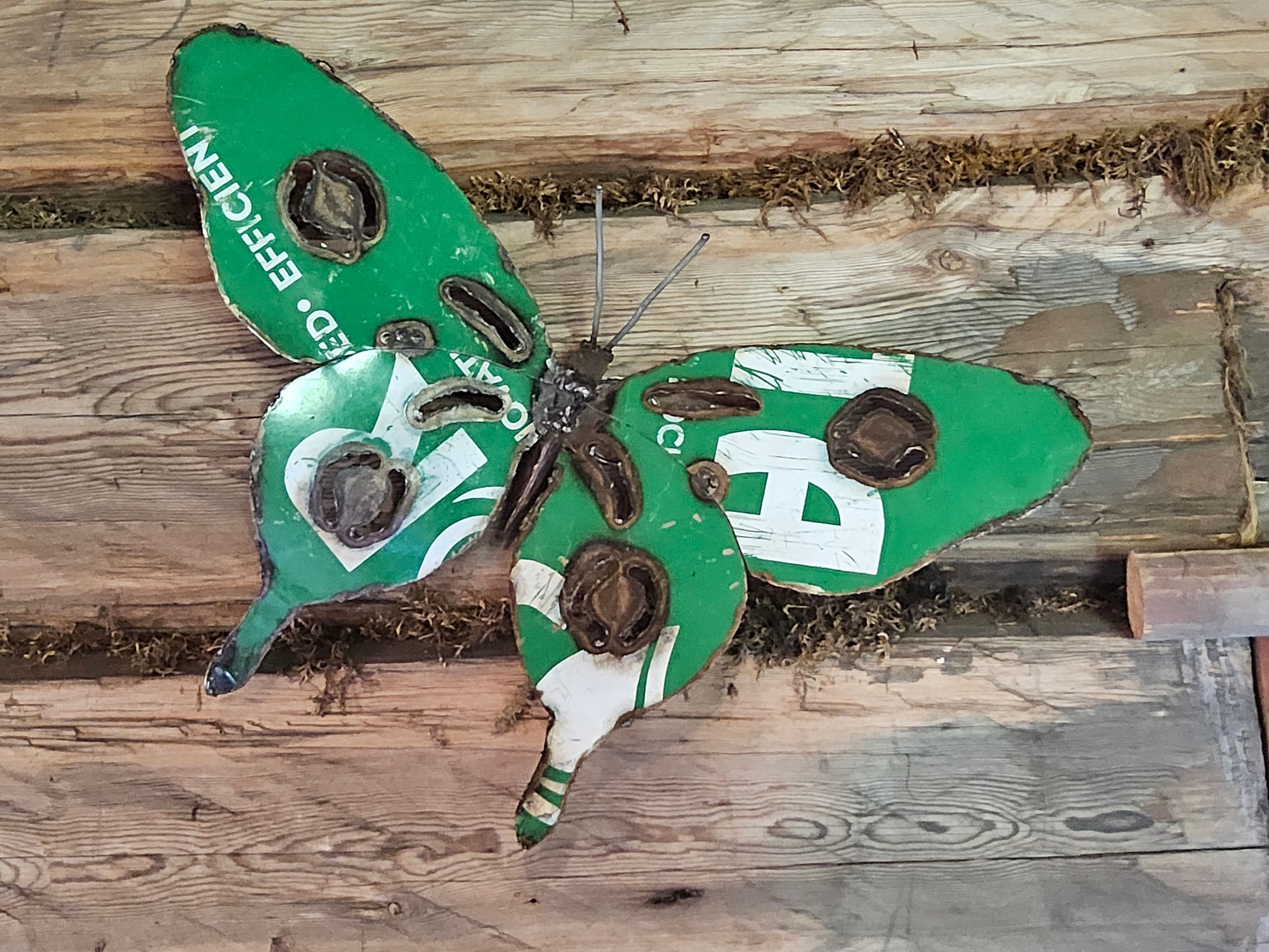 Denna fjäril är handsvetsad av återvunnen metall och går att fästas på väggen.