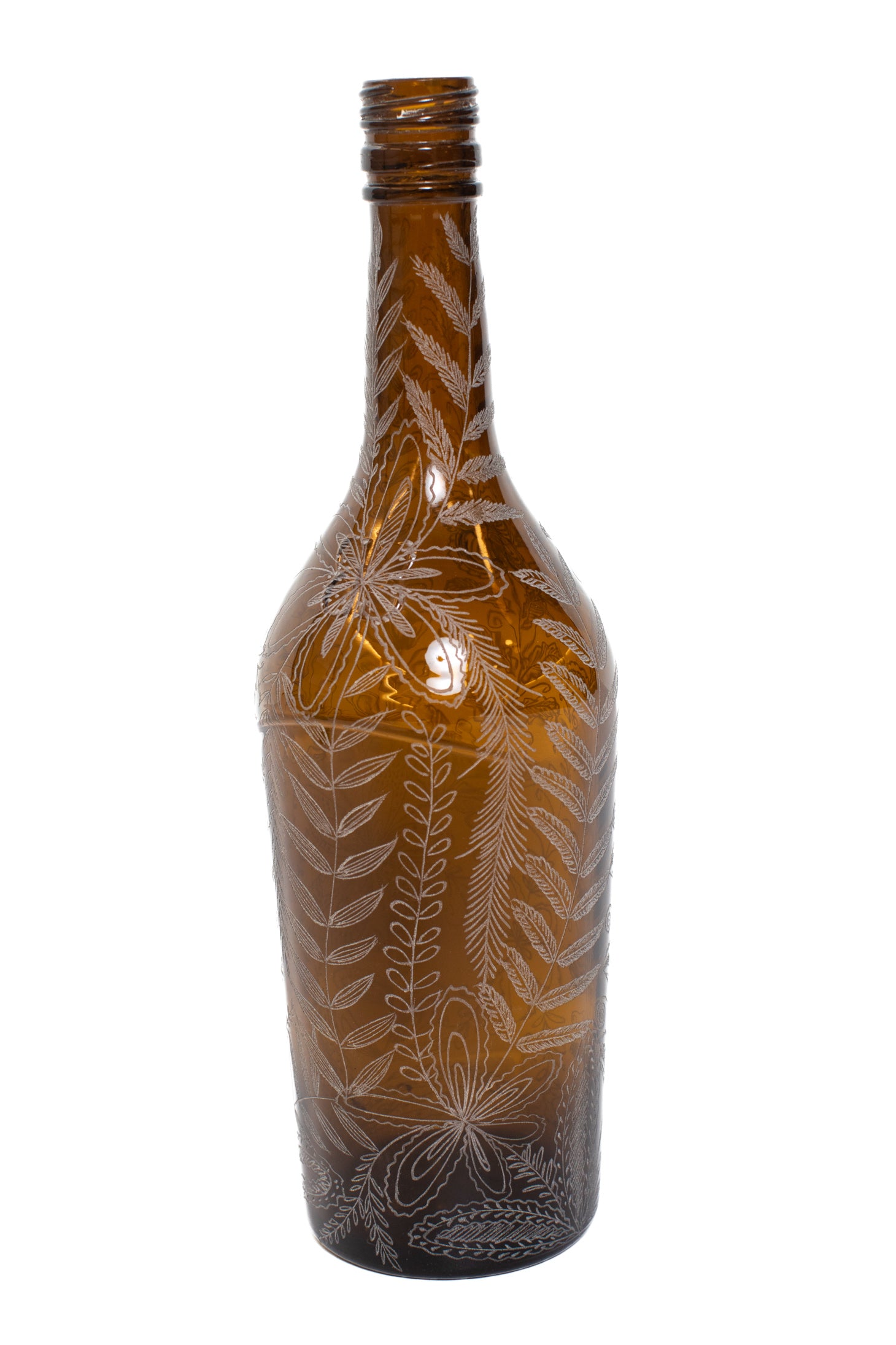Denna vackra, handgraverade flaska är ett stilfullt tillskott till middagsbordet eller nattduksbordet. Tillverkad av en återbrukad vinflaska, den är dekorerad med eleganta löv- och blommotiv och kan kompletteras med en handblåst flaskknopp, beroende på tillgång och önskemål.
