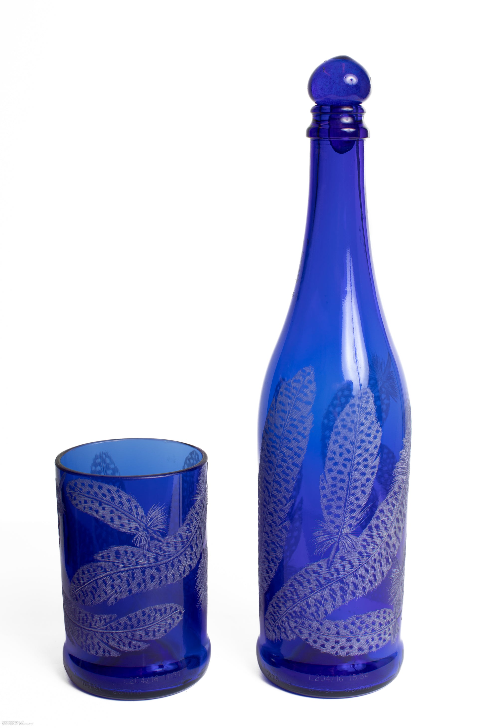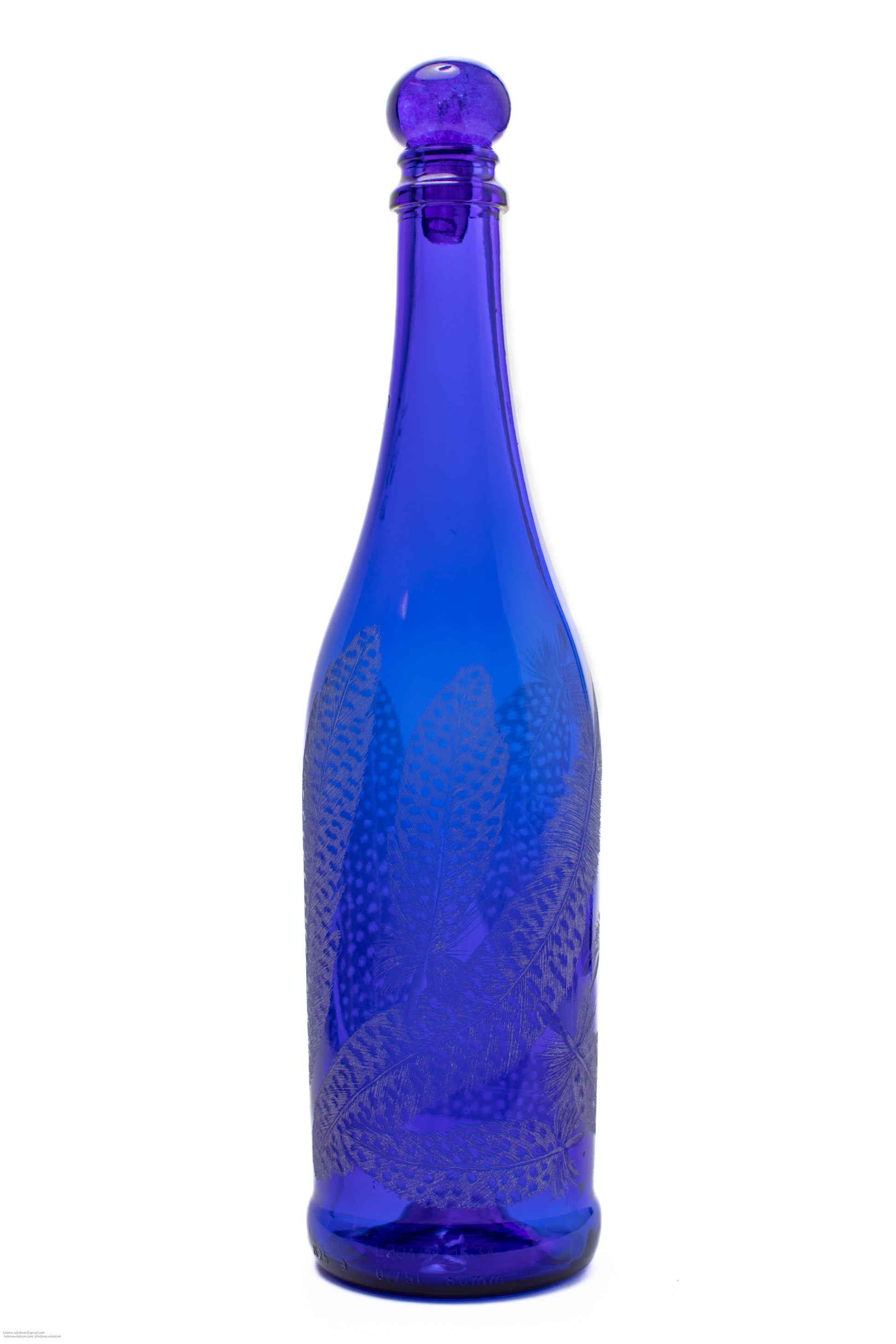 Handgraverad flaska 31 cm fjädrar blå