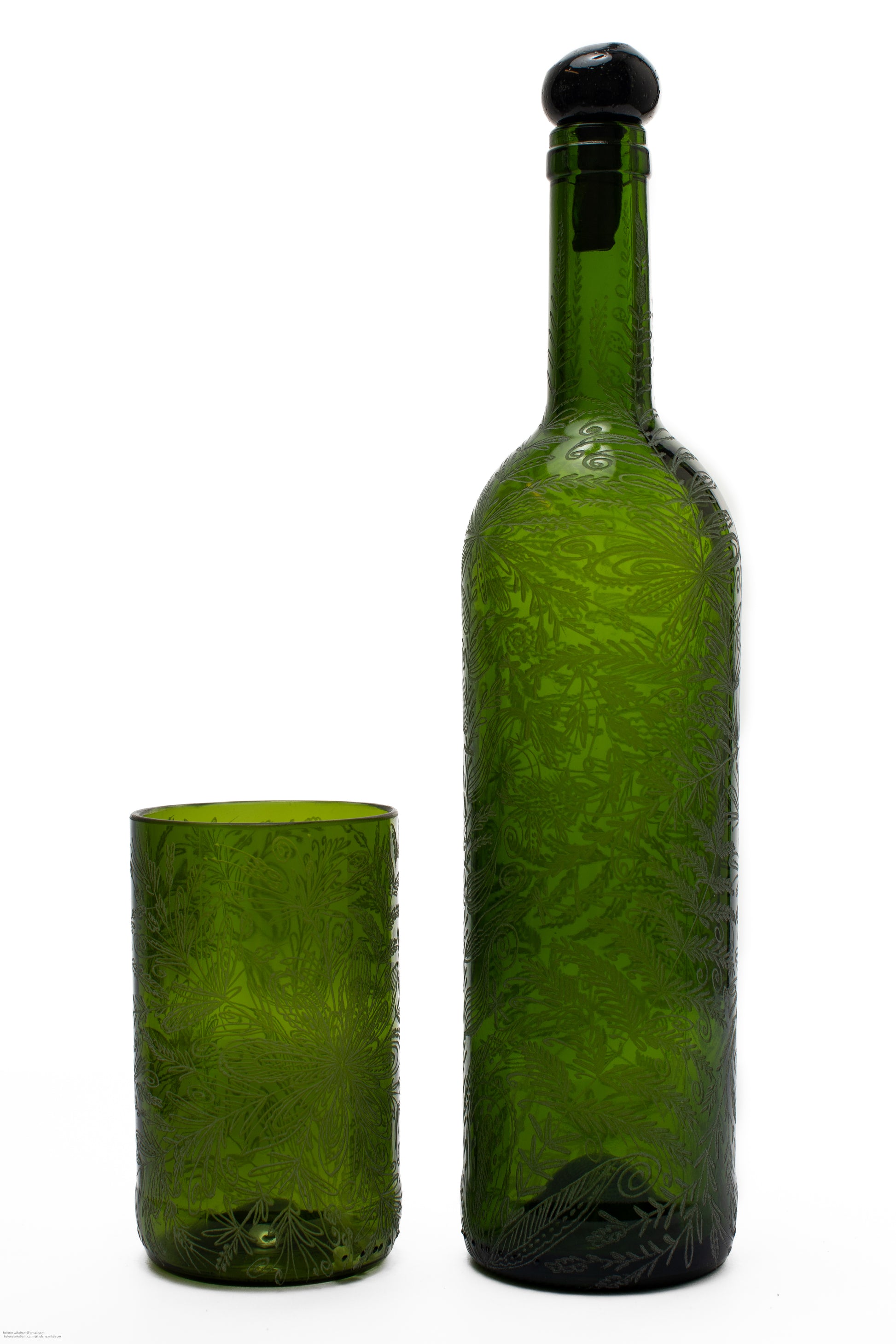 Denna handgraverade flaska blir en vacker detalj för bordsvatten på middagsbordet eller nattduksbordet. Flaska från återbrukad vinflaska dekorerad med blad och blommor, med en handblåst flaskknopp i mån om tillgång och om så önskas. Kombinera gärna med matchande glas.