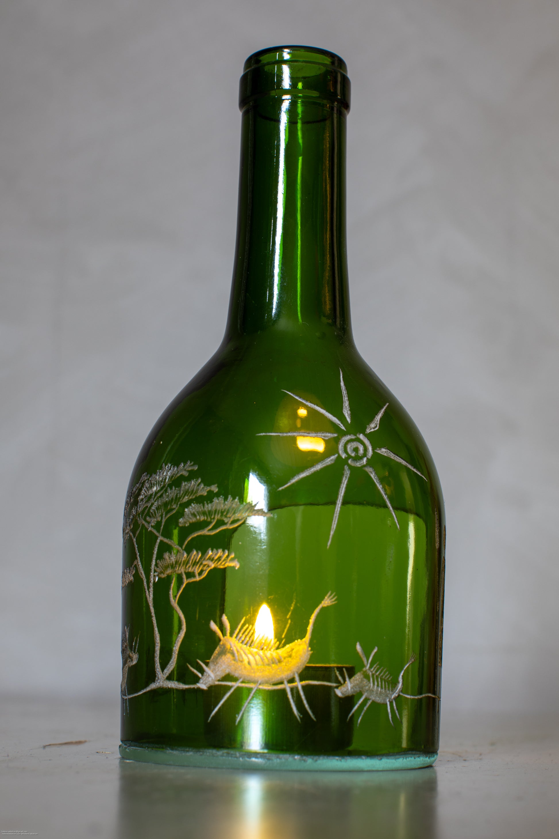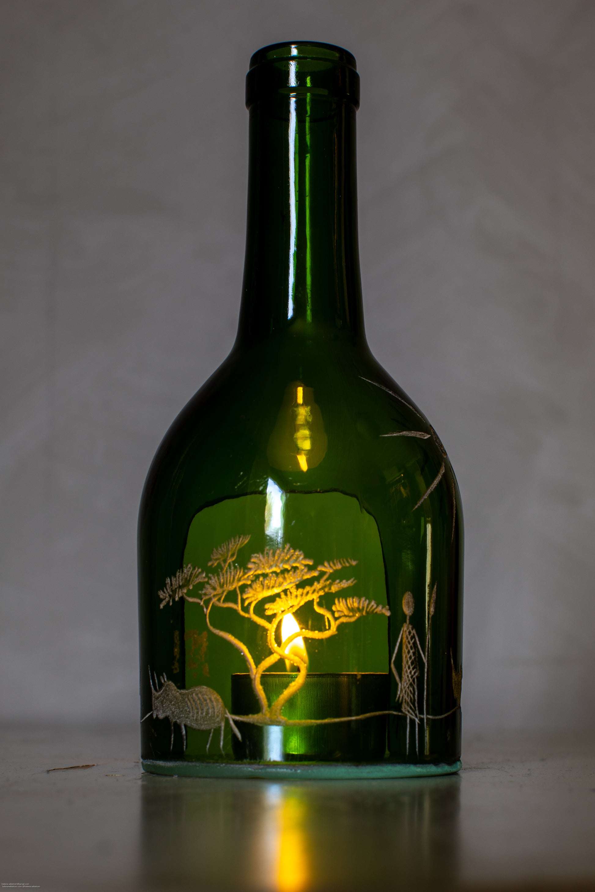Värmeljuslykta skapad från en återanvänd flaska med gravyr inspirerad av den kenyanska savannen. Den övre delen av flaskan har använts och limmats fast på en glasskiva, och därefter har en öppning skurits ut för att tillåta placering av ett värmeljus i hållaren. Lyktan kastar ett stämningsfullt ljus genom gravyren.