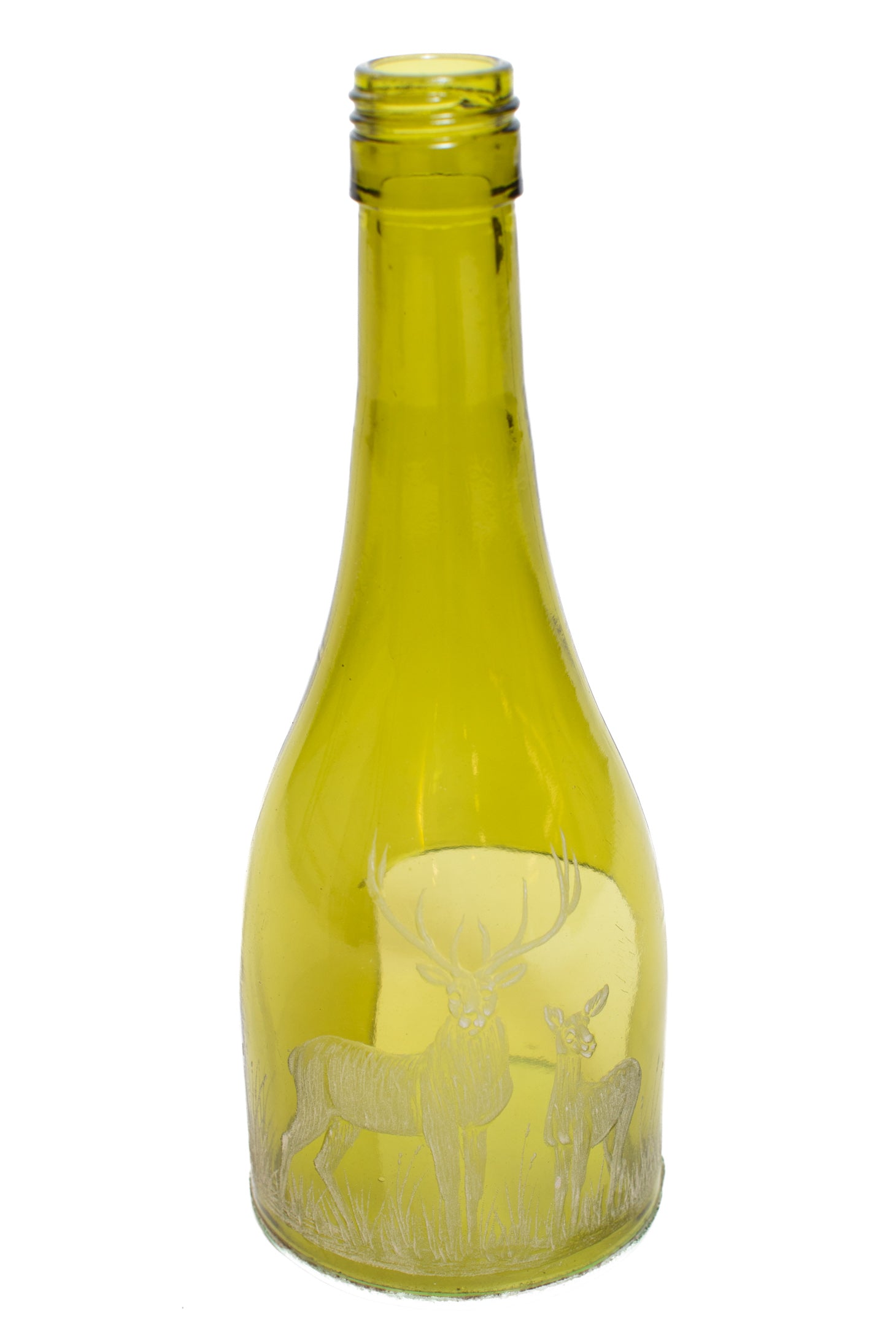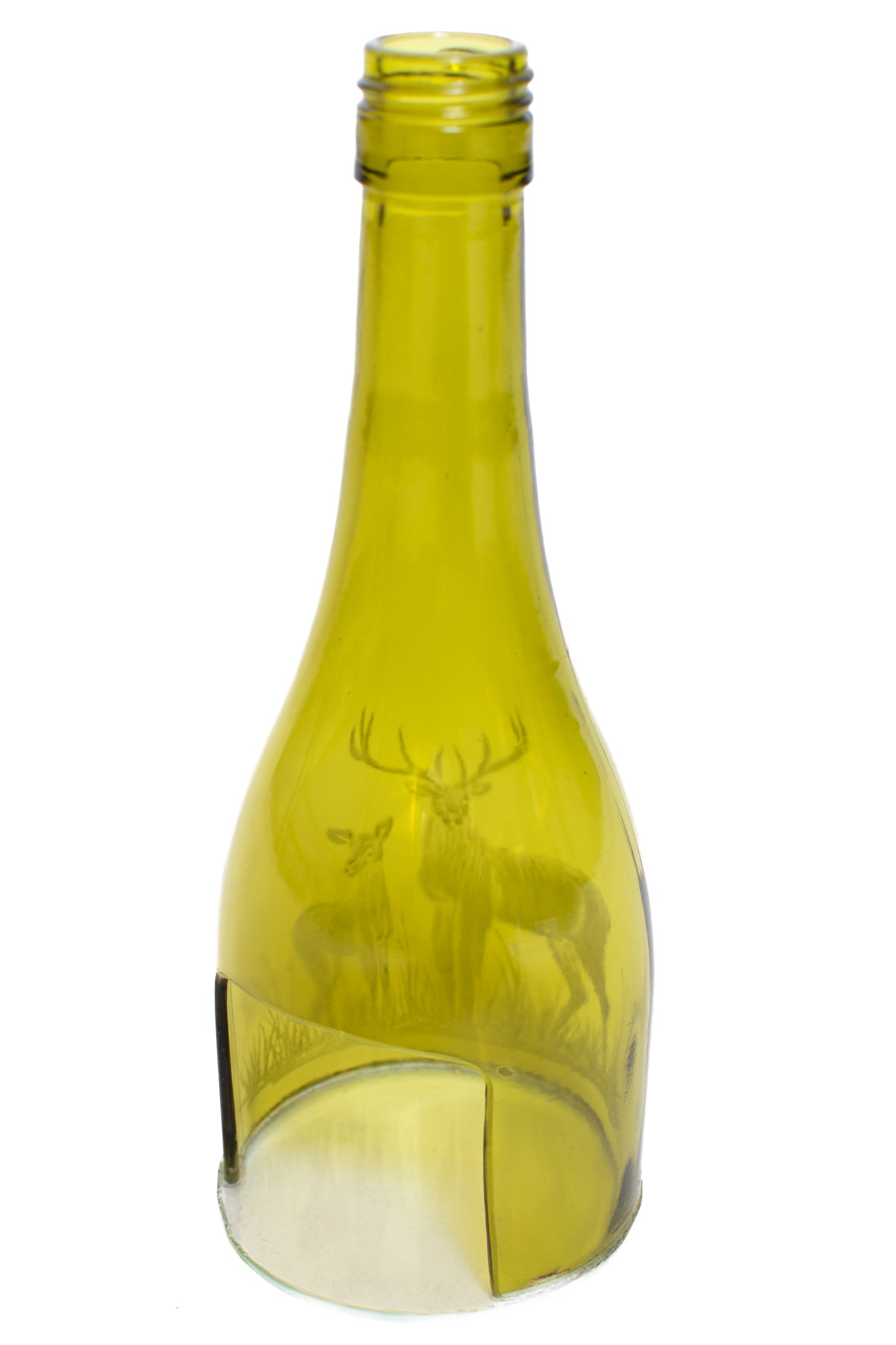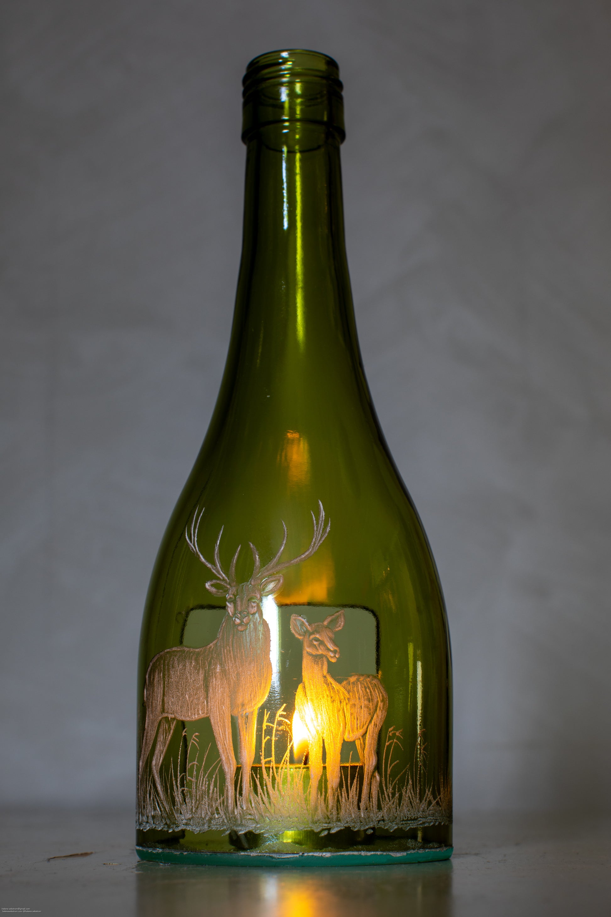 Värmeljuslykta skapad från en återanvänd flaska med en handgraverad hjort. Den övre delen av flaskan har använts och limmats fast på en glasskiva, och därefter har en öppning skurits ut för att tillåta placering av ett värmeljus i hållaren. Lyktan kastar ett stämningsfullt ljus genom gravyren.