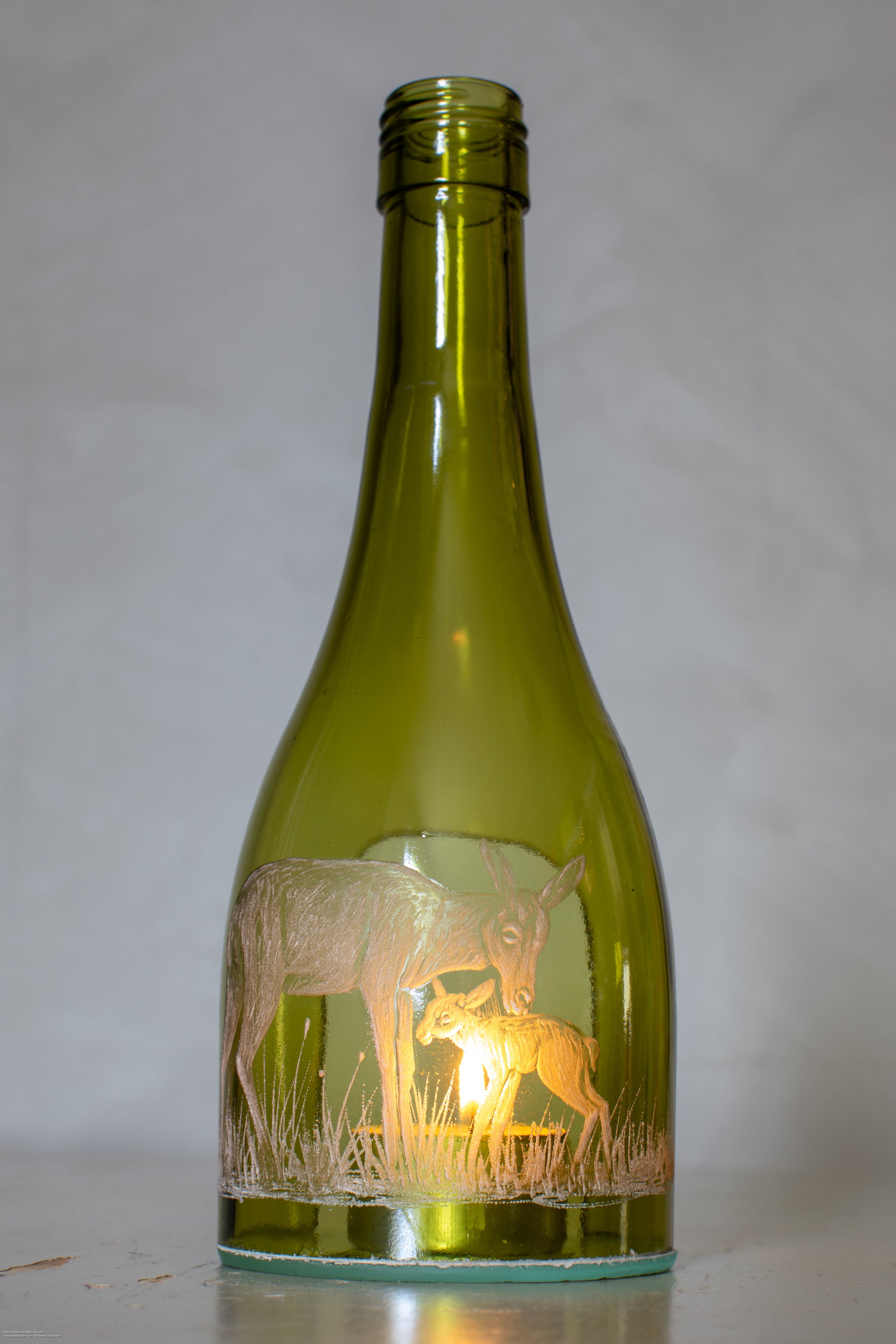 Värmeljuslykta skapad från en återanvänd flaska med handgraverade rådjur. Den övre delen av flaskan har använts och limmats fast på en glasskiva, och därefter har en öppning skurits ut för att tillåta placering av ett värmeljus i hållaren. Lyktan kastar ett stämningsfullt ljus genom gravyren.
