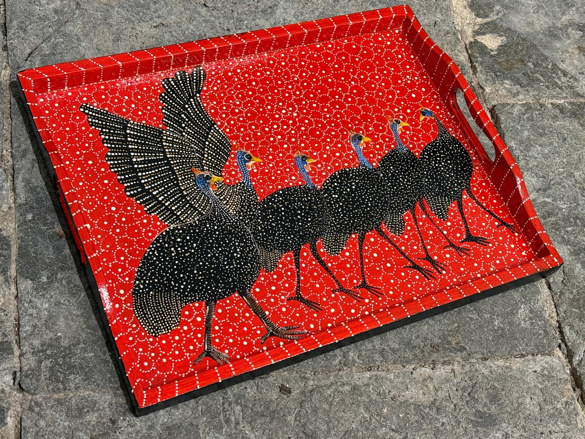 Lägg till en touch av kenyanskt hantverk i ditt hem med denna charmiga träbricka, handgjord och målad av den talangfulle konstnären Emmanuel. Brickan pryds av sex vackra pärlhönor i svart och blått med vita prickar på en röd bas och kant som skapar en elegant inramning. Perfekt som serveringsbricka, dekoration eller en unik gåva.