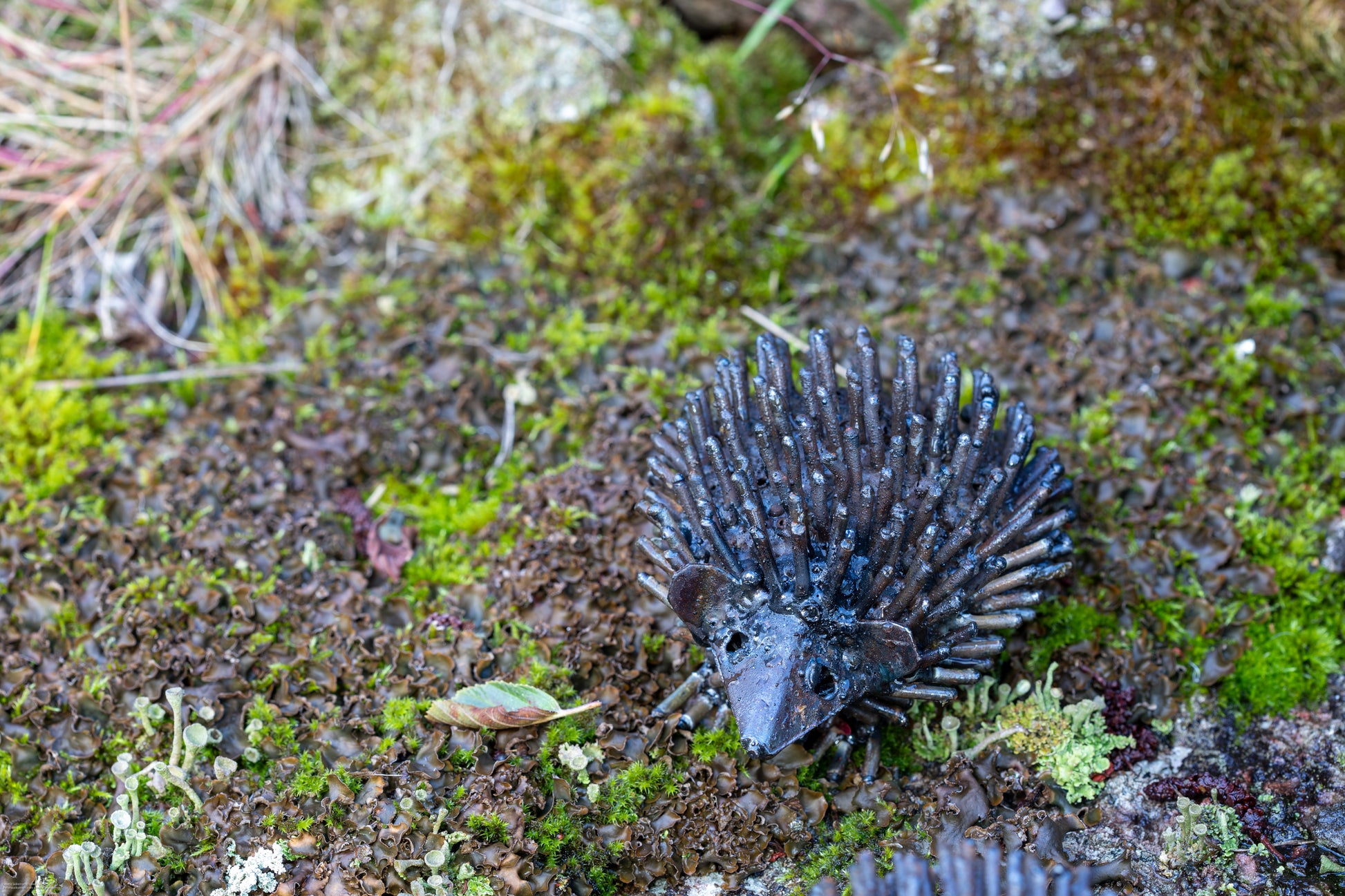 Igelkotten är svetsad och sedan lackad och tål att stå både inomhus och utomhus. Underhåll den med till exempel rå linolja för att undvika rostbildning.