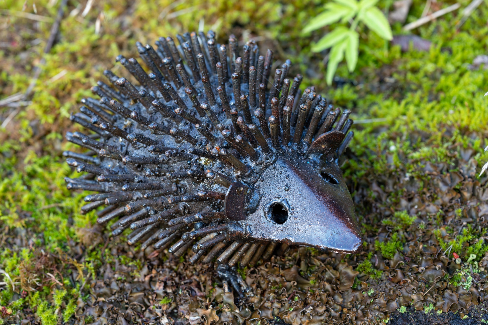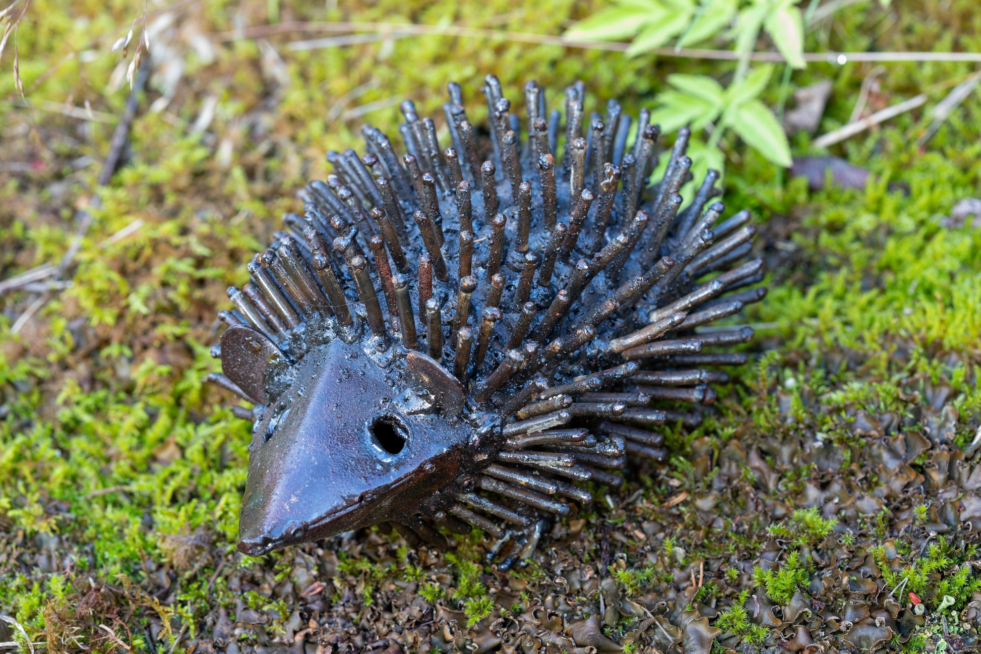 Igelkotten är svetsad och sedan lackad och tål att stå både inomhus och utomhus. Underhåll den med till exempel rå linolja för att undvika rostbildning.