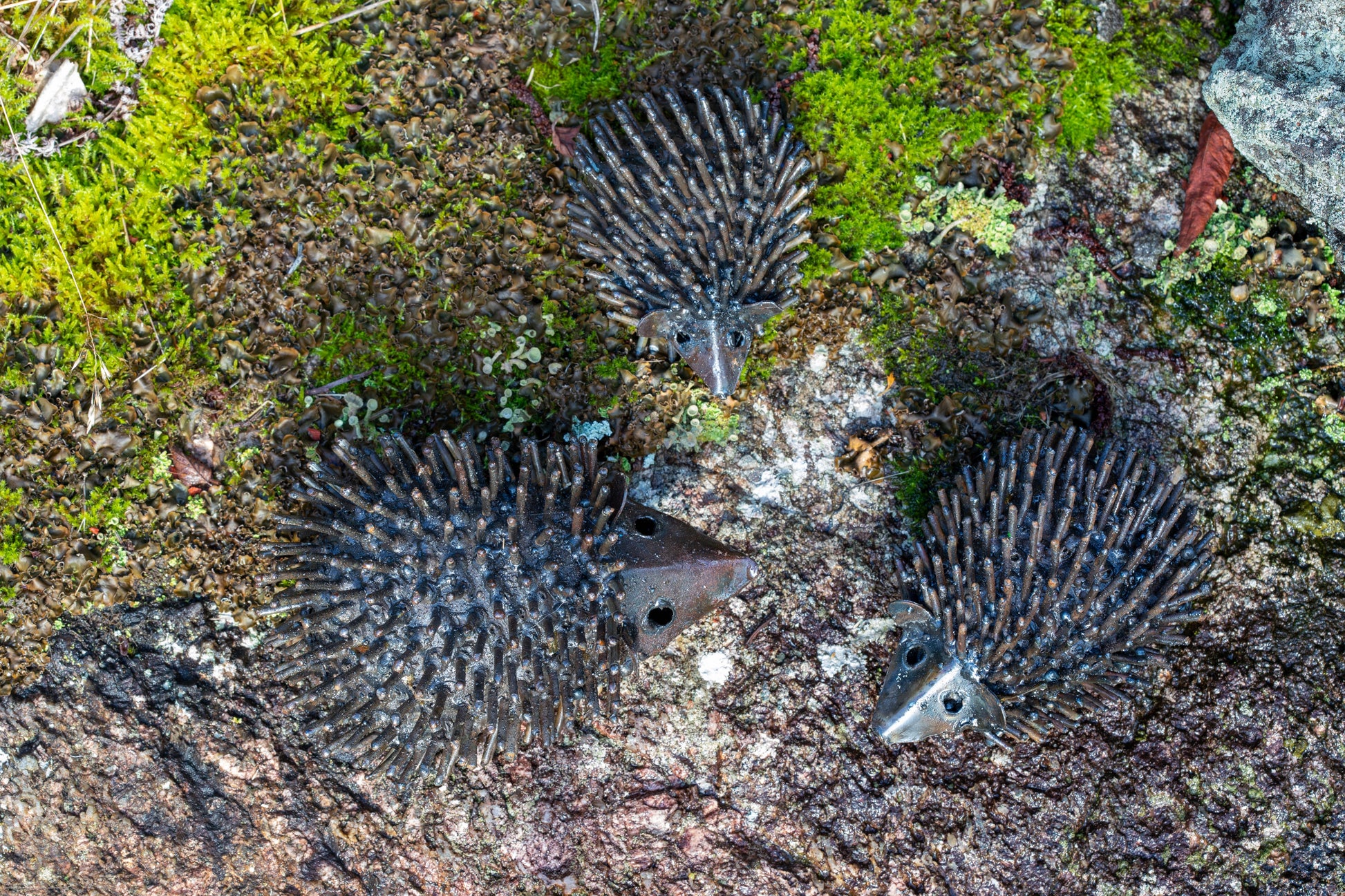 Igelkotten är svetsad och sedan lackad och tål att stå både inomhus och utomhus. Underhåll den med till exempel rå linolja för att undvika rostbildning.