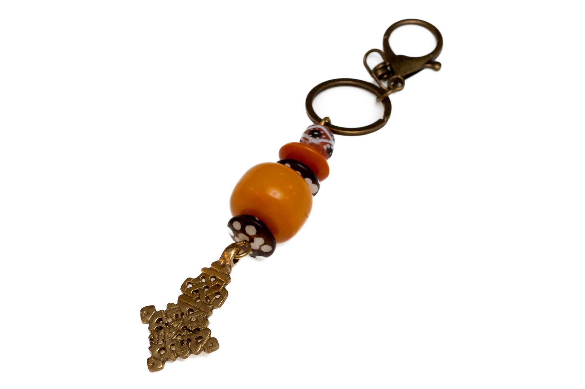 Nyckelring med pärlor och ett etiopiskt kors, varje exemplar med en unik design. Den är försedd med en hake för att kunna fästas på en väska som ett smycke eller på en ryggsäck.