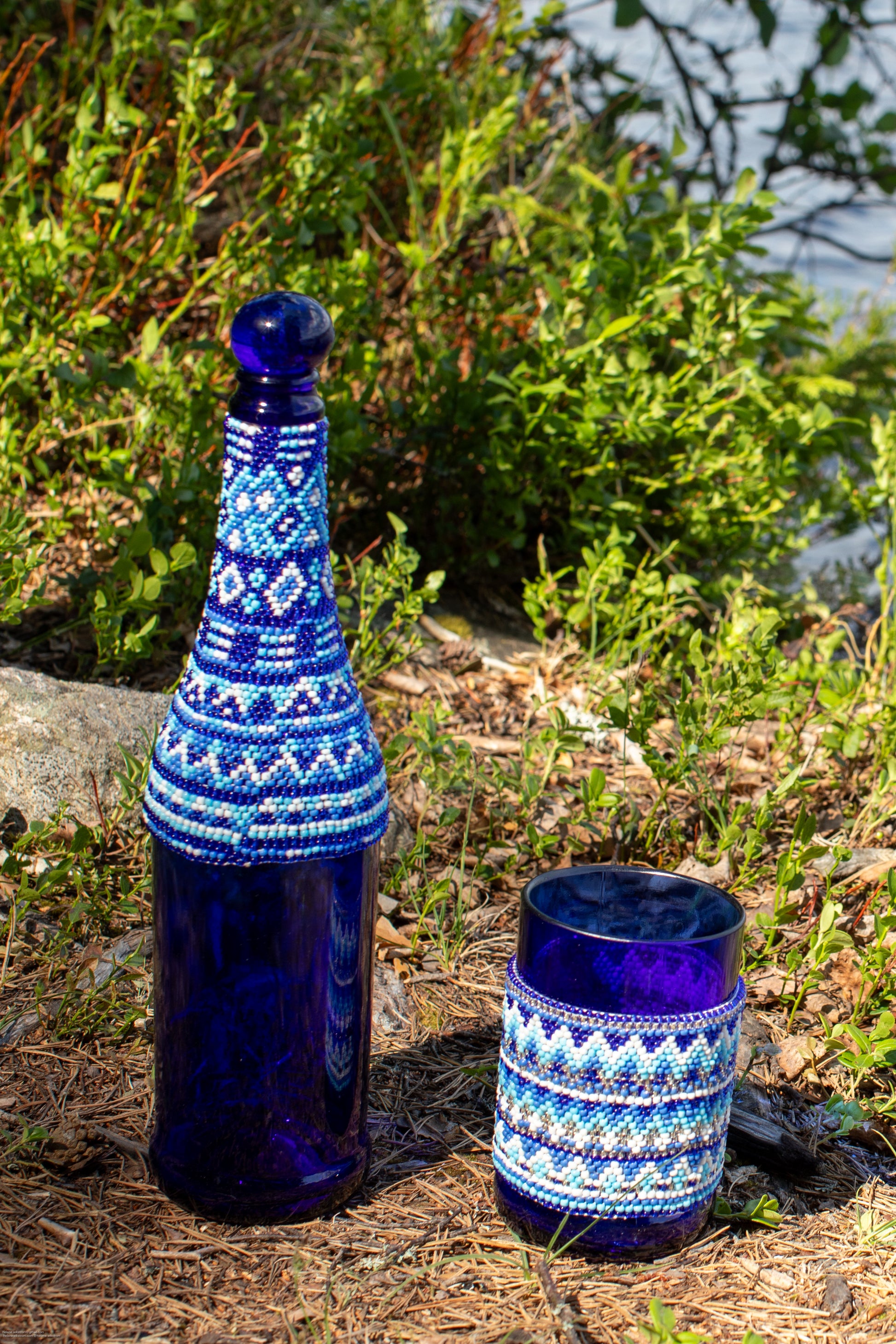 Pärlbroderad flaska 15 cm blå