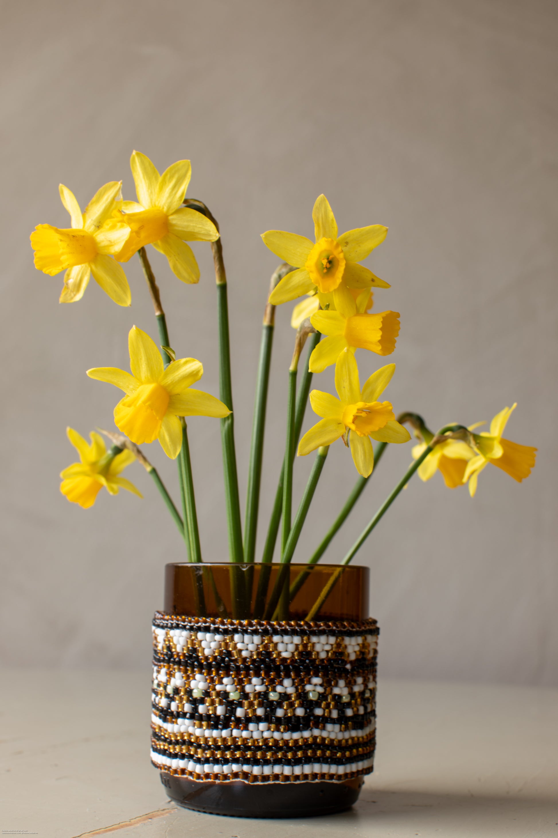 Pärlbroderad vas av återbrukad ölflaska. Kombinera gärna med matchande flaska. Passar också bra som pennhållare, tandborstglas och eller liknande.