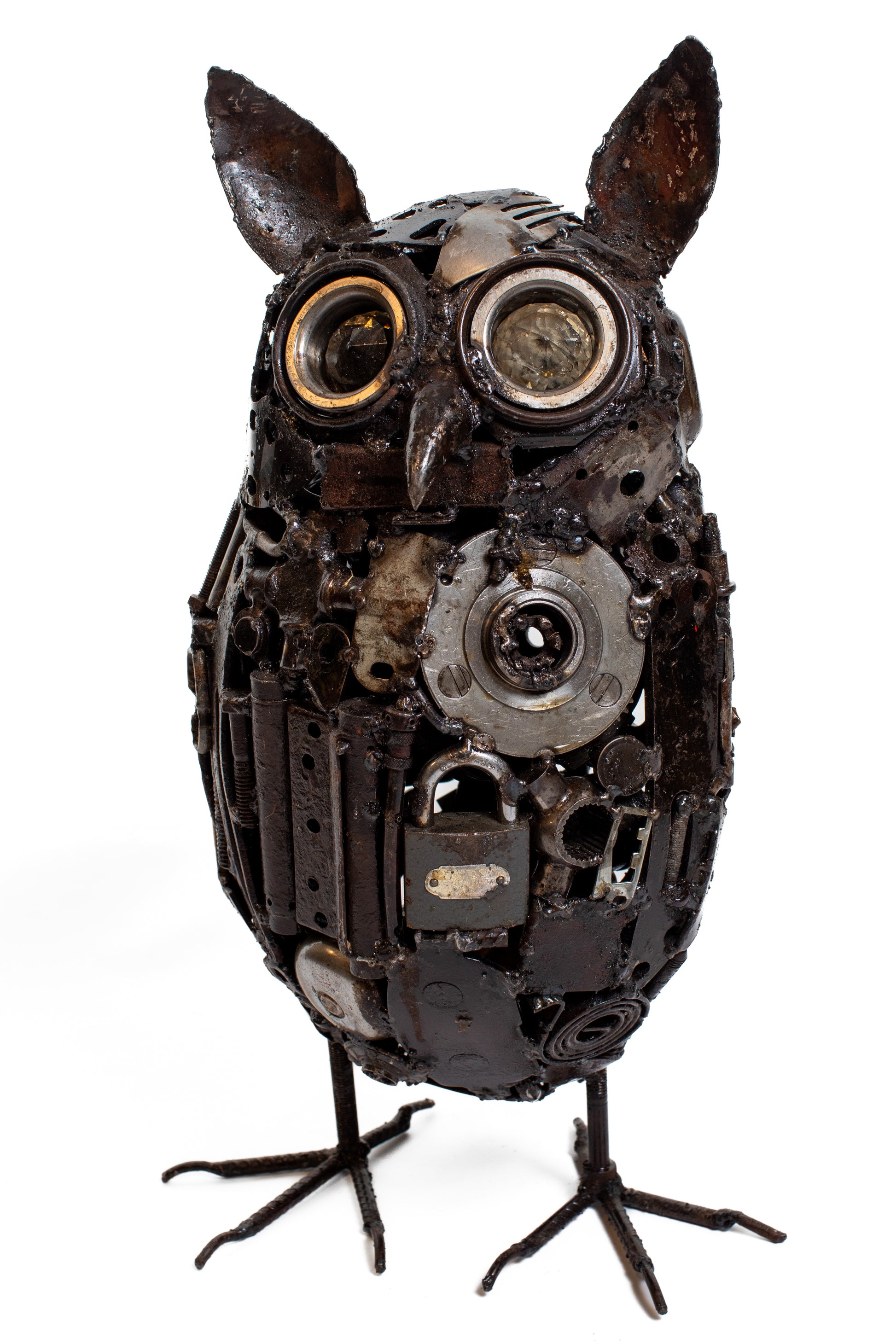 Handgjord uggla tillverkad av återvunnen metall och olika reservdelar. Ugglan blir fin som inredning inomhus eller som trädgårdskonst .