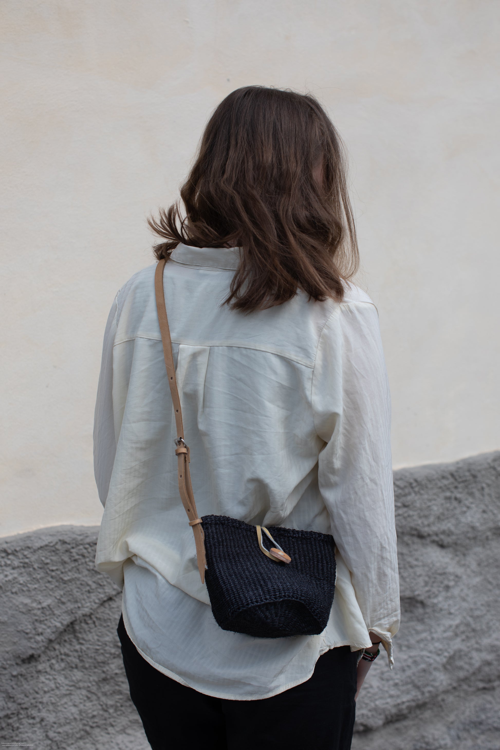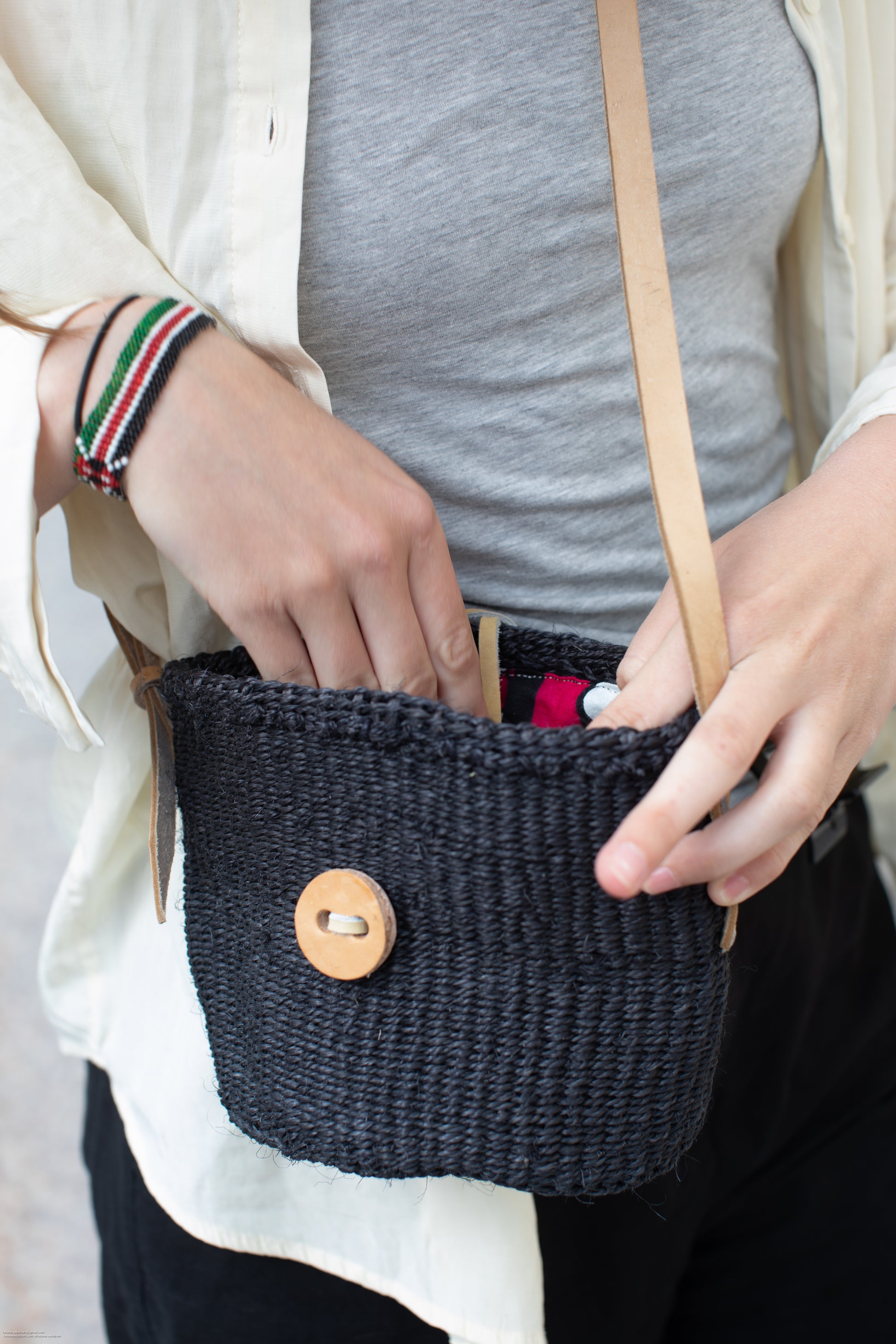 Handvävd sisalkorgväska fodrad med kanga-tyg och en justerbar ljus, lång läderrem. Den är mångsidig och kan även användas som hängande kruka eller för förvaring av exempelvis borstar i badrummet.