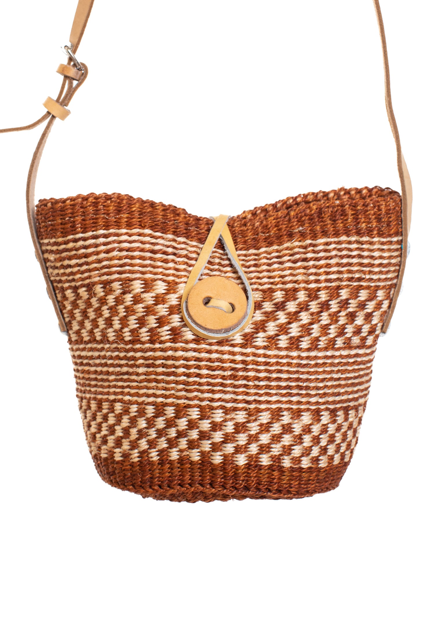 Handvävd korgväska i sisal, fodrad med kangatyg och en ljus, lång läderrem. Den är mångsidig och kan användas som ampel eller för förvaring av exempelvis borstar i badrummet.