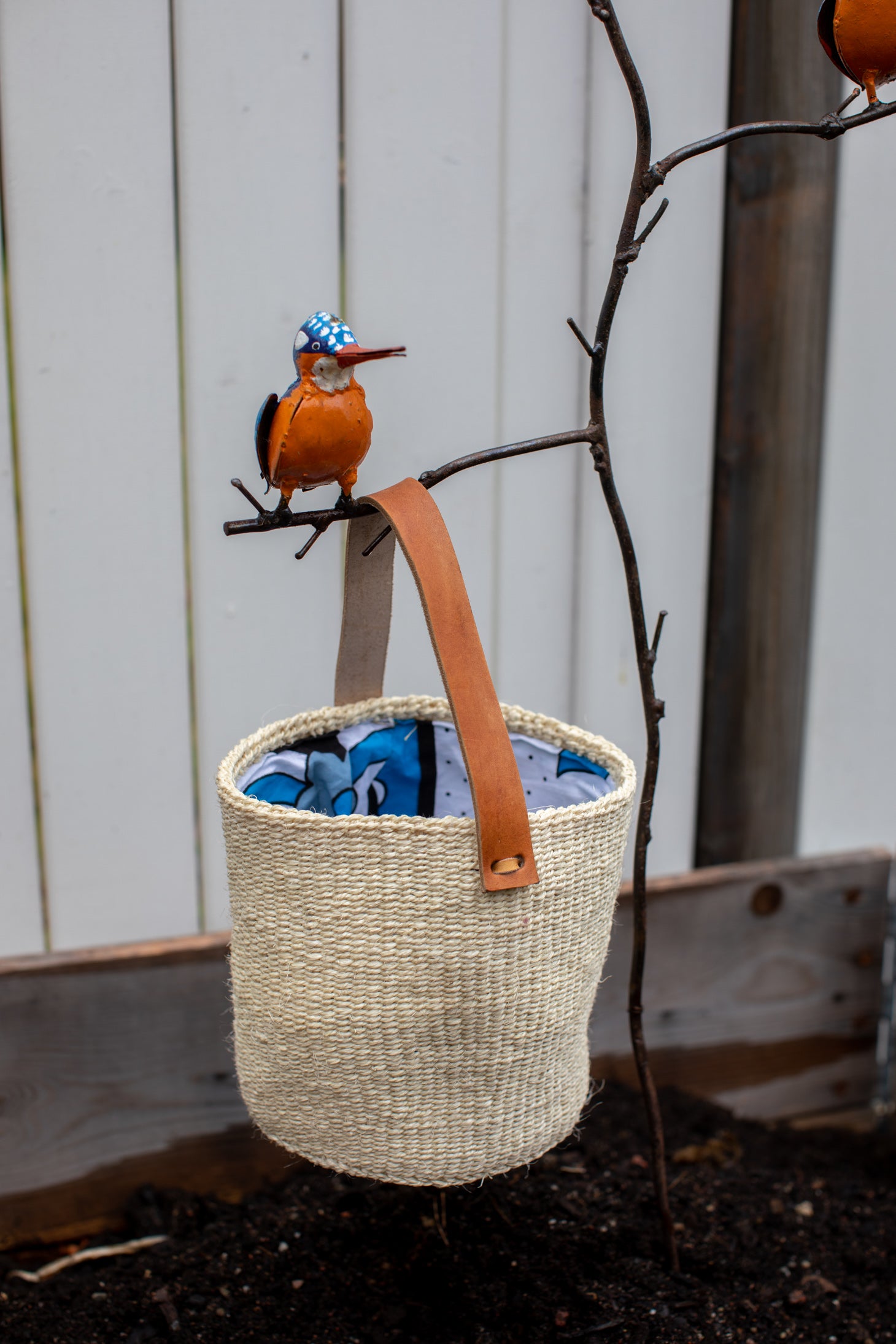 En liten sisalväska, handvävd med en kort rem i ljust läder och kanga-foder, passar utmärkt för att bära småföremål som mobiltelefoner, nycklar och liknande. Den är också praktisk för att organisera föremål inomhus, som borstar i badrummet, eller utomhus.