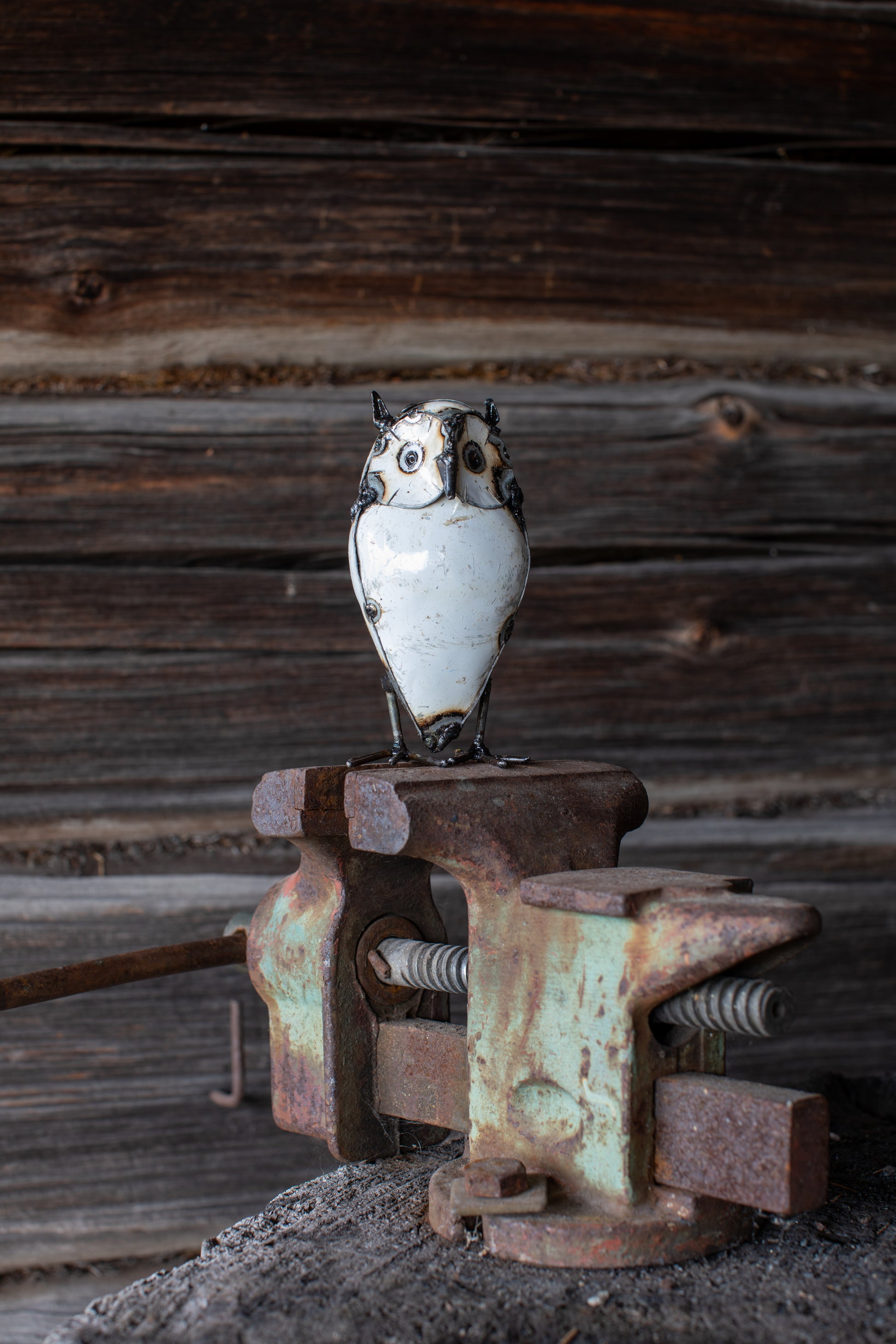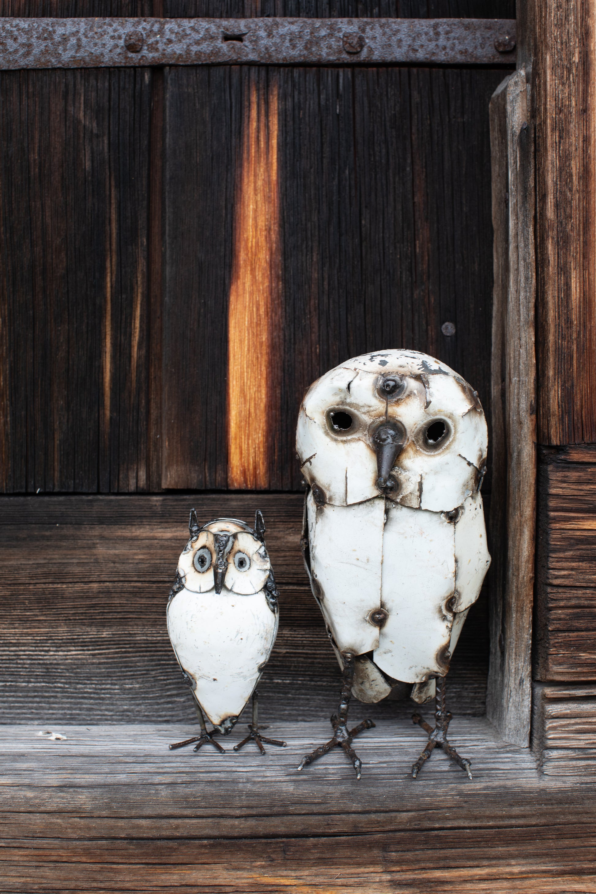 Handgjord uggla av återvunnen metall som passar både inomhus, och som trädgårdskonst eller balkongkonst.