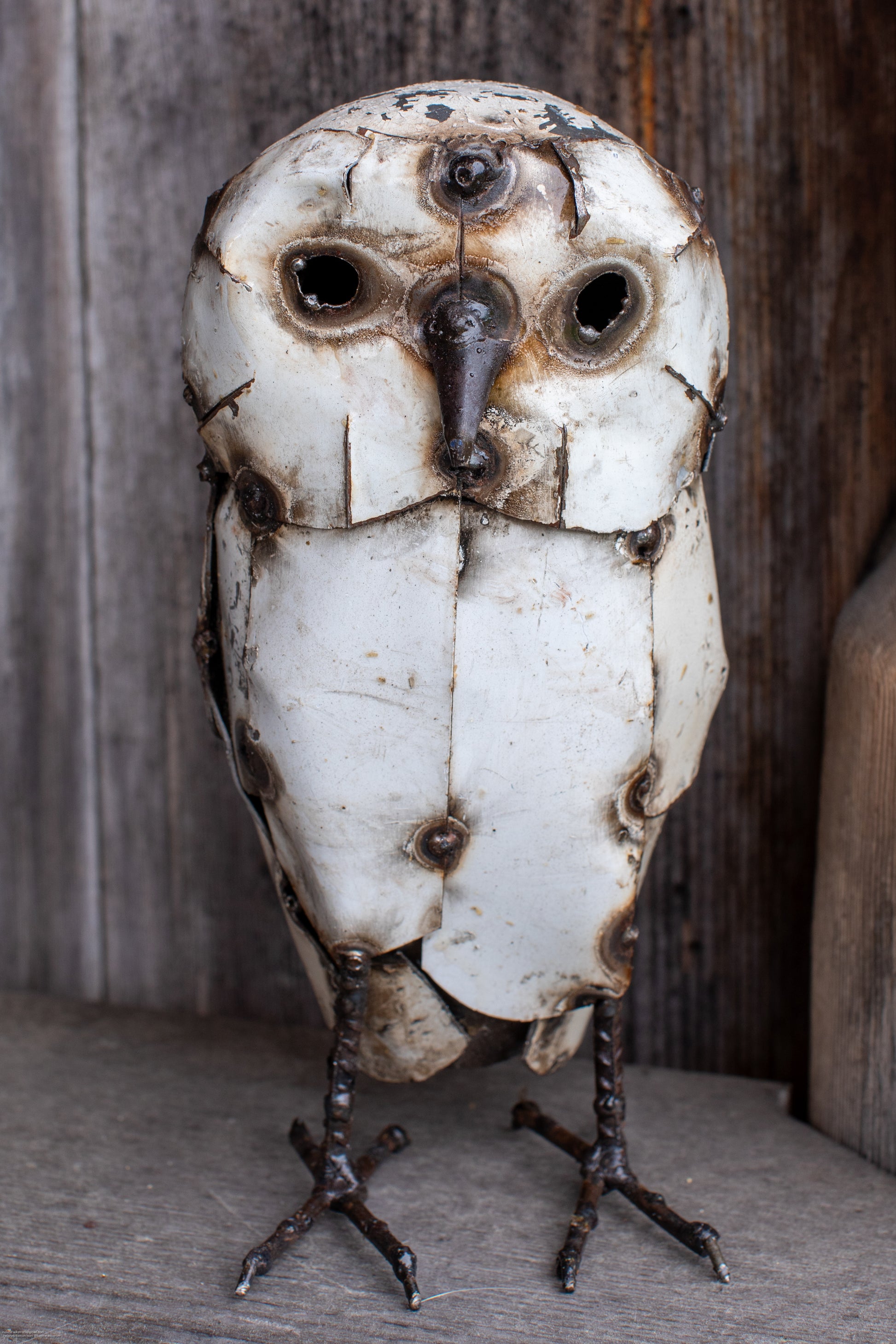 Handgjord uggla av återvunnen metall som passar både inomhus, och som trädgårdskonst eller balkongkonst.